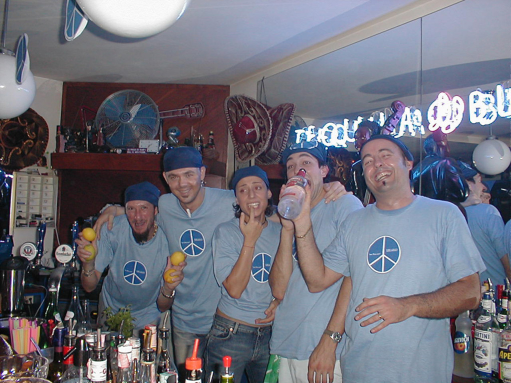 1999. La festa di Carnevale è il primo appuntamento di rilievo dell’anno. L’estate ha inizio con il Party California Drink Men” parodia dei più famosi Streap Men al mondo i California Dream Men. In collaborazione con la discoteca Byblos di Riccione organizziamo il 7° compleanno del “Tequila”. Un Pullman alla cui guida il gettonatissimo ”Badarello”, un nome una garanzia perchè l’unico autista da badare”, ci trasporta in quel di Riccione. Il viaggio di ritorno, alle prime ore del mattino, richiede tappa obbligata in Autogrill dove avvengono le situazioni più disparate causa “fumi dell’alcool”. Il Tormentone” musicale è scritto ed eseguito dal Piotta classico burino romano con il singolo “Supercafone”. Da qui lo spunto per la Festa del 15 Agosto “Ferragosto Coatto”. Il Tequila si trasforma in un Emporio vecchio stile dove appesi si possono trovare: sottane, calzoni, camice, bermuda e vestiti degli anni 70/80. Chi non è già vestito a tema può attingere al corredo messo da noi a disposizione. Come sempre accade inizialmente regna la titubanza e un pò freddezza sul da farsi, come l’alcool entra in circolo ecco il delirio, gente che si sveste e riveste calzini, t-shirt, mutande che volano da tutte le parti, gente che balla in ogni angolo del locale e soprattutto grande sintonia tra tutti i presenti. Un piacere!!! Durante l’estate l’ appuntamento esterno è al Parco Acquatico ACQUABELL di Bellaria “Bagnoschiuma”. Nella Discoteca del Parco e a ridosso della piscina a onde allestiamo piccoli Chiringuiti e svariati punti musica per ballare. La serata non è delle più calde malgrado ciò molti ne approfittano per tuffarsi. Nel mese di novembre diamo il via ad una nuova avventura il TABAXCO social club a Rimini. Così si chiama l’ennesimo locale che gestiamo in collaborazione con la famiglia Antolini. Filippo Malatesta entra a far parte dello staff Tequila e ha come compito la gestione del live del sabato sera, appuntamento caratterizzante del locale. Per quanto riguarda il Venerdì creiamo una collaborazione con gli amici del Risky Business di Rimini, Paolino, Picci, Leo e la Iena. Le nostre conoscenze e l’apporto delle ottime collaborazioni fanno si che il locale nel giro di poco tempo diventi un punto di ritrovo straordinario. La particolarità del locale era il Forno a Legna che a qualsiasi ora della serata permetteva a chiunque di stuzzicare la Pizza. Molto utile nella fase di chiusura del locale dove molti clienti e noi in primis un po alticci, potevano smaltire “l’onda anomala”.