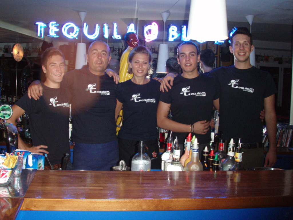 1992. Con all’aiuto di un Barman professionista come il Nik” mi sono addentrato in questa nuova avventura che consisteva nell’offrire ad un paesino piccolo come San Mauro Mare un Bar specializzato in Cocktail , in Short e Long Drink(inserire la foto della carta Cocktail) . Il locale era aperto 20 ore su 24 dalla mattina con colazioni fino alla notte come Cocktail Bar. L’esperienza avuta precedentemente con la gestione del locale “La Luna nel Pozzo” di Bellaria, mi ha permesso di avere una base di gente con cui lavorare. La fortuna ha voluto a sua volta di ottenere consenso con i ragazzi del posto che hanno permesso, non solo con la loro presenza ma anche con la loro collaborazione, di diventare luogo di incontro per tutti i giovani del Paese. Fulcro del locale il Banco Bar disegnato dall’architetto Carlo Verona , sgabelli e sedie da regista arredavano la parte interna ed esterna, tende arancioni riparavano dal sole e privo di infissi le serrande in ferro aprivano e chiudevano il locale. Il colore blu era l’elemento di raccordo tra gli arredi. Le Freccette o Dardi, inizialmente con punta in ferro, fungevano da passatempo ed elemento d’ostacolo per l’accesso al bagno. La modestia del locale era sopportata dalla professionalità e simpatia dello Staff tra cui Cristian” primo ed unico cameriere del Tequila. Un elemento promozionale che ci ha permesso di riscuotere un discreto successo è la Fidelity Card una tessera che al seguito di un tot di bevute permetteva al cliente di vincire la T-shirt del Tequila che col passare degli anni è diventata oggetto di “culto” tra i frequentatori.