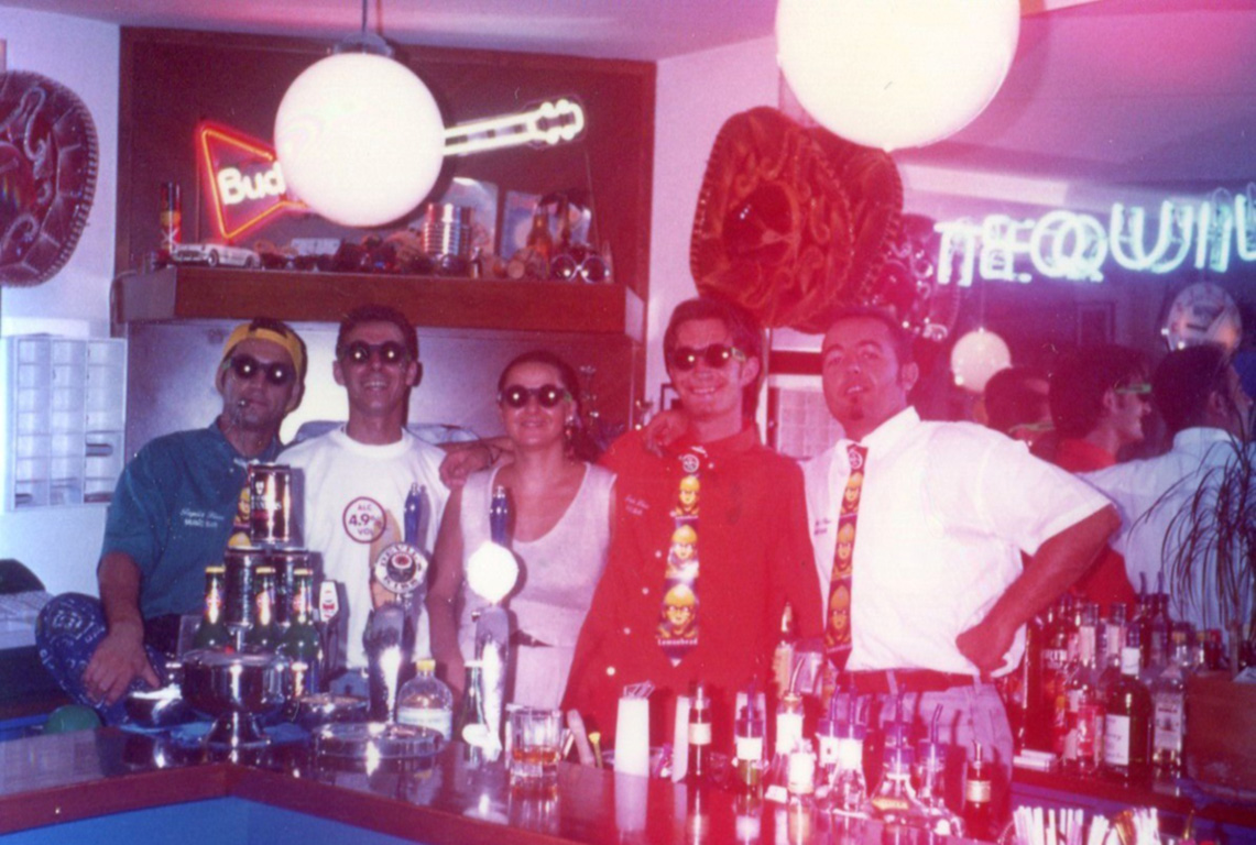 1994. Nell’estate del 1994 iniziano le prime feste a tema in collaborazione con le case distributrici di alcolici, tra queste il TequilaParty con la ditta Tequila Sauza. Hostess intrattengono i clienti con giochi e assaggi di Tequila regalando Gadget pubblicitari. La musica, cuore del locale, viene proposta anche dal vivo tra i nostri gruppi amici gli YellowCab” da Verona con Teo, Andrea e Daria che danno il via a questo percorso che si protrarrà per diversi anni nel locale. Sempre in quell’estate Tazio, uno dei fedelissimi, propone di formare la prima squadra di calcetto del Tequila. Il risultato è immediato vinciamo il torneo e festeggiamo come sempre con dosi abbondanti di alc…..! Alla fine dell’estate sostituiamo le serrande in ferro con infissi a permettendo l’apertura anche nel periodo invernale. Il 31 dicembre affittiamo una casa a Santarcangelo per festeggiare l’Ultimo dell’Anno. Un gruppo di amici cuochi ( Gianni, Sandro) preparano la cena annaffiata con Sangiovese e Veuve Clicquot.