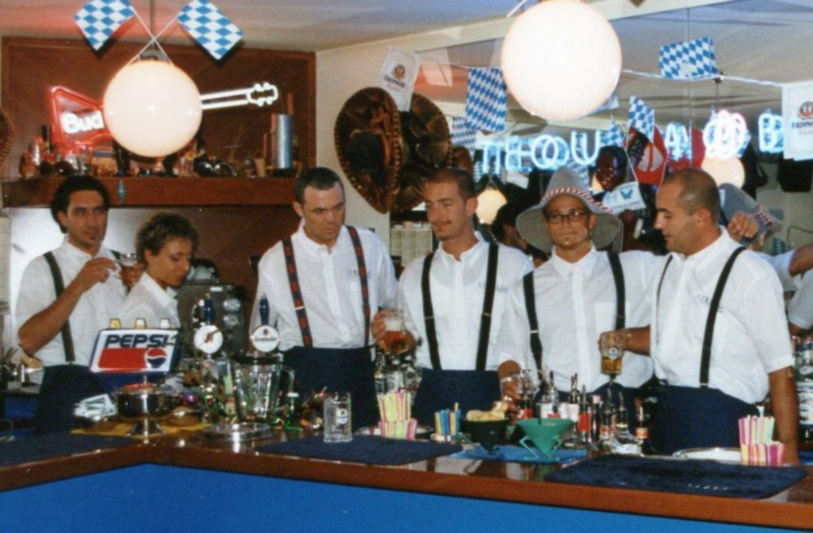 1996. Per tutto l’inverno continua la collaborazione con il Caminetto” che con il nostro inserimento è diventato ”Tequila” e come tradizione organizziamo la festa di Carnevale “nel Segno di Zorro”. Verso la fine di aprile dopo la parentesi esterna riapriamo il Tequila Blues. Checco parte per il militare quindi dobbiamo trovare un sostituto. Luca è il prescelto, amante del sud America, sorriso e spirito gioioso, entra a far parte dello Staff. Il tema del Ferragosto è “PigiamaParty” un classico intramontabile ma sempre di grande effetto. La serata calda fa si che il tasso alcolico si alzi e da li a poco la festa diventa una bolgia. La partecipazione e totale, la strada antistante diventa parte integrante del locale e tra “Pitali” riempiti con Birra, musica incalzante si arriva a mattina tra le proteste del vicinato. All’inizio dell’inverno instauriamo una collaborazione con il “MASKENADA” ex Cotton Club di Cervia dive tutti i sabati sera gestiamo il piano superiore del locale. Pre serata al Tequila per poi trasferire tutta la truppa in quel di Cervia. La selezione musicale è affidata a Teo e Derek con Micio e Max che fanno da supporto con le percussioni , il responsabile dei bar è Nik”.