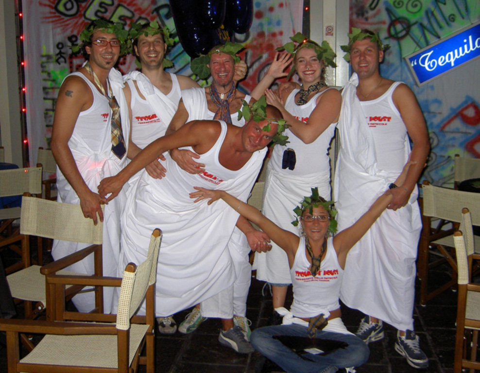 1999. La festa di Carnevale è il primo appuntamento di rilievo dell’anno. L’estate ha inizio con il Party California Drink Men” parodia dei più famosi Streap Men al mondo i California Dream Men. In collaborazione con la discoteca Byblos di Riccione organizziamo il 7° compleanno del “Tequila”. Un Pullman alla cui guida il gettonatissimo ”Badarello”, un nome una garanzia perchè l’unico autista da badare”, ci trasporta in quel di Riccione. Il viaggio di ritorno, alle prime ore del mattino, richiede tappa obbligata in Autogrill dove avvengono le situazioni più disparate causa “fumi dell’alcool”. Il Tormentone” musicale è scritto ed eseguito dal Piotta classico burino romano con il singolo “Supercafone”. Da qui lo spunto per la Festa del 15 Agosto “Ferragosto Coatto”. Il Tequila si trasforma in un Emporio vecchio stile dove appesi si possono trovare: sottane, calzoni, camice, bermuda e vestiti degli anni 70/80. Chi non è già vestito a tema può attingere al corredo messo da noi a disposizione. Come sempre accade inizialmente regna la titubanza e un pò freddezza sul da farsi, come l’alcool entra in circolo ecco il delirio, gente che si sveste e riveste calzini, t-shirt, mutande che volano da tutte le parti, gente che balla in ogni angolo del locale e soprattutto grande sintonia tra tutti i presenti. Un piacere!!! Durante l’estate l’ appuntamento esterno è al Parco Acquatico ACQUABELL di Bellaria “Bagnoschiuma”. Nella Discoteca del Parco e a ridosso della piscina a onde allestiamo piccoli Chiringuiti e svariati punti musica per ballare. La serata non è delle più calde malgrado ciò molti ne approfittano per tuffarsi. Nel mese di novembre diamo il via ad una nuova avventura il TABAXCO social club a Rimini. Così si chiama l’ennesimo locale che gestiamo in collaborazione con la famiglia Antolini. Filippo Malatesta entra a far parte dello staff Tequila e ha come compito la gestione del live del sabato sera, appuntamento caratterizzante del locale. Per quanto riguarda il Venerdì creiamo una collaborazione con gli amici del Risky Business di Rimini, Paolino, Picci, Leo e la Iena. Le nostre conoscenze e l’apporto delle ottime collaborazioni fanno si che il locale nel giro di poco tempo diventi un punto di ritrovo straordinario. La particolarità del locale era il Forno a Legna che a qualsiasi ora della serata permetteva a chiunque di stuzzicare la Pizza. Molto utile nella fase di chiusura del locale dove molti clienti e noi in primis un po alticci, potevano smaltire “l’onda anomala”.